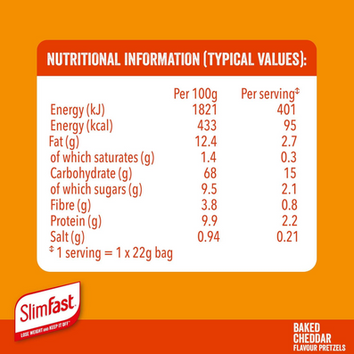 SlimFast Baked Cheddar Flavour Bites Multipack (24 x 22g) are oven-baked wheat and potato biscuits with a savoury cheddar flavour, offering a satisfying crunch for just 95 kcal per pack. Perfect for when you're craving something savoury, they make an ideal snack to enjoy as part of your weight management routine.