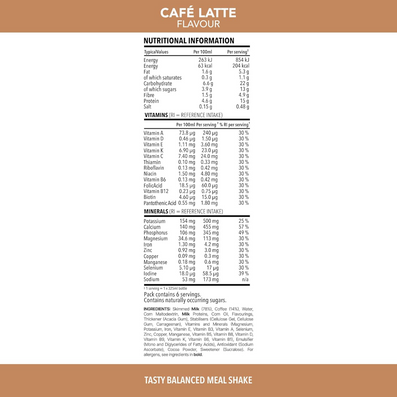 SlimFast Tasty Balanced Meal Cafe Latte Milkshake Multipack (6 x 325g) offers a convenient and satisfying solution for weight management, ideal for those with a busy lifestyle. Each creamy shake delivers a balanced meal with just 204 kcal, packed with 15g of protein, a good source of fibre, and enriched with 23 essential vitamins and minerals including Vitamin B6, B12, Magnesium and Zinc.