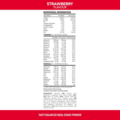 SlimFast Tasty Balanced Meal Powder Strawberry Tub (50 Servings 1825g) offers a convenient and delicious way to support weight loss and long-term weight maintenance. Each smooth, strawberry-flavoured shake is quick to prepare and packed with 15g of protein, a source of fibre, and enriched with 23 essential vitamins and minerals including Vitamin B6, B12, Magnesium and Zinc.