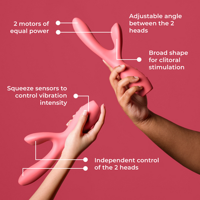 Featuring dynamic dual-motor vibration technology, it enhances clitoral pleasure with two equally powerful motors and a broad external head that stimulates more nerve endings. Offering a fully customisable experience, it includes 9 creative pulsation effects and independent control of each head for mind-bending pleasure. Designed to adapt to unique anatomies, the adjustable angle between the two heads ensures a sensual inside-out embrace tailored to your body. With a sturdy ergonomic grip and responsive squeeze sensors, intensity is easily fine-tuned; the harder you squeeze, the stronger the vibrations. Cruelty-free & vegan-friendly.
