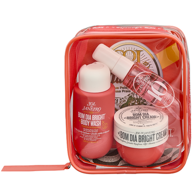 Sol De Janeiro Bom Dia Bright 3 Piece Jet Set is an attractive zip travel cosmetic bag containing a trio of Sol De Janeiro pamper products in travel-friendly mini sizes including Sol De Janeiro's Bom Dia Bright Clarifying AHA BHA Body Wash, Bom Dia Bright Body Cream and Cheirosa 40 Perfume Mist.