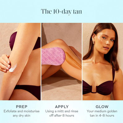 - Mousse - exfoliate and moisturise dry areas, hands, feet, ankles and wrists. Glide on using a tanning mitt to avoid missed patches. Leave for 8 hours before showering off. Your tan will develop over 6-8 hours into a medium golden glow. Exfoliate and moisturise daily to prolong your tan.
