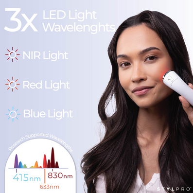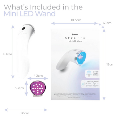 StylPro Mini LED Wand is a compact, travel-friendly skincare device that delivers targeted LED Light Therapy to help improve skin tone, clarity and radiance in just three minutes per session. Featuring Red (633nm), Blue (415nm) and Near Infrared (830nm) light wavelengths across three intuitive modes, morning, day and evening, this device works to reduce dark marks, calm redness and boost natural luminosity.