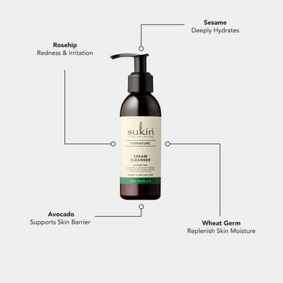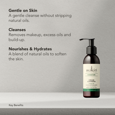 Sukin Cream Facial Cleanser (125ml) is a nourishing, soap-free formula that gently removes makeup, dirt, and impurities while maintaining the skin's natural moisture balance. Enriched with a blend of Rosehip, Avocado, Sesame, and Wheat Germ Oils, it provides lasting hydration and leaves the skin soft, supple, and refreshed. Aloe Vera, Cocoa Butter, Nettle, and Horsetail extracts soothe and condition, helping to calm dryness and promote a healthy, radiant complexion.