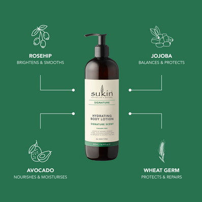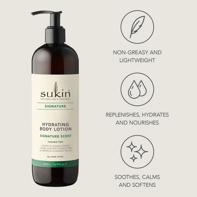 Sukin Hydrating Body Lotion Signature Scent (500ml) is a nourishing everyday moisturiser enriched with a blend of natural oils and botanical extracts. Formulated with Sesame Seed, Rosehip, Jojoba, Avocado, and Wheat Germ Oils, it helps restore your skin's natural moisture barrier, leaving it soft, supple, and deeply hydrated. The inclusion of Aloe Vera, Nettle, Horsetail, and Burdock provides a soothing, calming effect, ensuring skin feels refreshed and balanced after every use.
