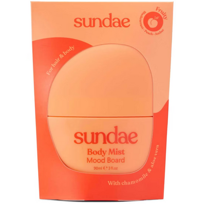 Sundae Hair & Body Fragrance Mist Mood Board (90ml) is a bright, fruity mist that refreshes both hair and skin with an ultra-fine spray. Infused with soothing Chamomile and hydrating Aloe Vera, it delivers an uplifting, optimistic scent that feels fun, flirty and full of good vibes.