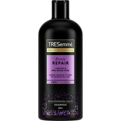 - 1 x TRESemme Biotin Repair Shampoo (680ml) - specially designed for damaged hair, harnessing the power of Biotin and Pro-Bond Complex to visibly repair signs of damage in just one wash It strengthens each strand from within, reducing breakage and restoring resilience while targeting damage from styling, heat, and colouring. Gentle enough for daily use, this advanced formula reinforces the hair structure, minimises split ends, and leaves hair looking healthier, smoother, and more vibrant. Cruelty-free.