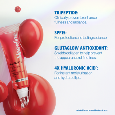 Formulated with 4 types of Hyaluronic Acid, GlutaGlow and SPF15, it provides instant moisturisation while helping smooth the appearance of fine lines and protect lips from daily environmental exposure. Developed by Vaseline scientists and backed by over 150 years of skincare expertise, the formula supports the delicate lip barrier while enhancing lips with a sheer, tone-boosting cherry red tint for a fresh, vibrant glow. Cruelty-free & vegan-friendly.