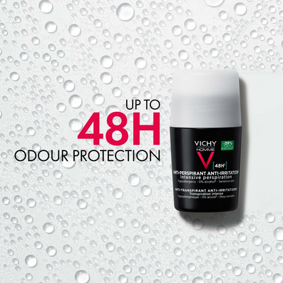 Vichy Homme 72h Anti-Perspirant Roll-On Deodorant (50ml) provides powerful, long-lasting protection against perspiration and odour while caring for sensitive skin. Formulated with Oligo-Zinc, it helps regulate excessive sweating while soothing irritation and maintaining comfort for up to 72 hours. The lightweight, non-sticky texture absorbs quickly, leaving skin soft, fresh, and residue-free for all-day confidence.