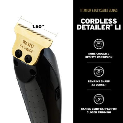 Wahl Professional Cordless Detailer Li Hair Trimmer Black features a close-cutting, extra-wide T-Shaped blade to enable straighter shape-ups and produce faster-cutting results than standard trimmer blades. Super lightweight yet incredibly powerful, the Cordless Detailer Black Li features an advanced rotary motor and an extra-wide T-shaped blade.
