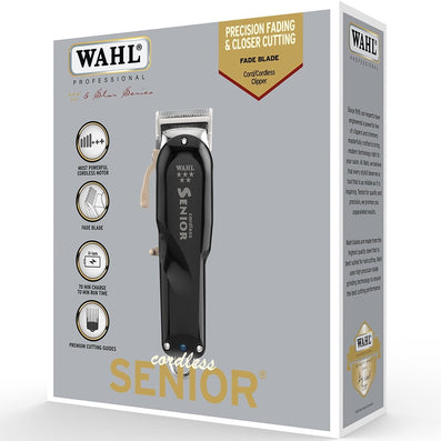 Wahl Professional Cordless Senior Hair Clipper features Wahl Professional's most powerful motor yet that generates a higher blade speed with increased torque for more cutting power. Never run out of power with this cordless clipper as it can be used on the cord if its battery is low. The Lithium-Ion technology power pack gives up to 70 minutes run time and only takes 70 minutes to fully recharge!