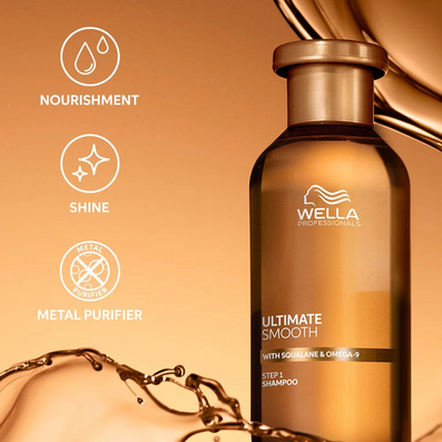 Wella Professionals Ultimate Smooth Shampoo (100ml) gently cleanses while transforming dry, dull or frizzy hair from the very first wash. Infused with Metal Purifier technology, it detoxifies the hair by removing harmful metals, leaving it light, soft and visibly smoother with a salon-quality finish.