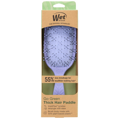 Wet Brush Go Green Thick Hair Paddle Detangler Brush Purple is an eco-friendly detangling brush designed especially for thick, coarse, curly and long hair. Gentle on both the hair and the environment, it features a larger paddle shape and a unique cluster pattern of ultra-soft IntelliFlex bristles that glide through dense strands with ease, helping to loosen knots without pulling or tugging.